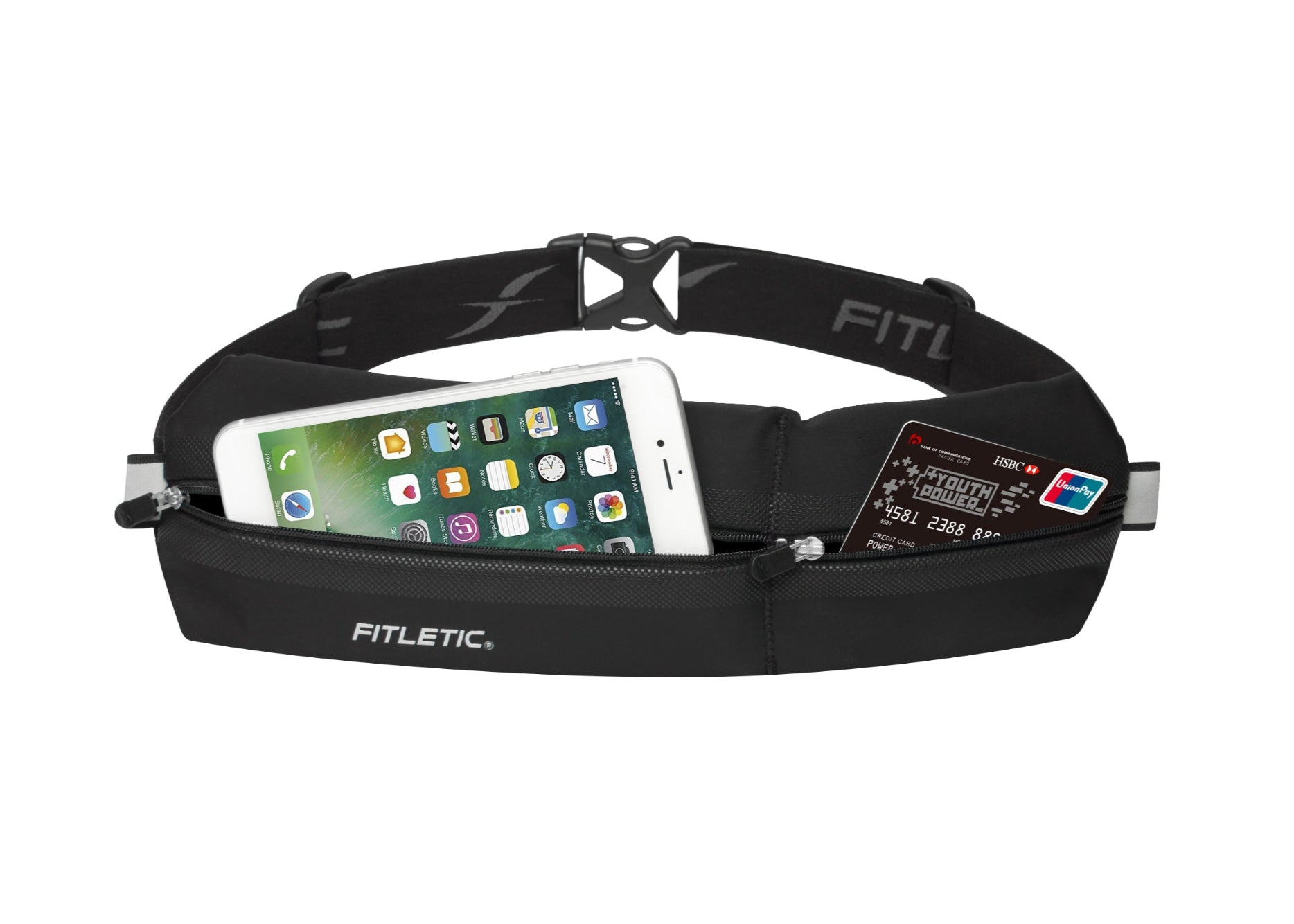One of our biggest, yet low-profile pouches, this athletic running belt has two compartments – one for your big phone, and the other for your keys, medical supplies, snacks or other essentials. The big pouch comes with an interior pocket for ID, credit card, and cash and can be customized with add-ons like water bottles, gels, and toggles for your race bib.